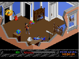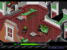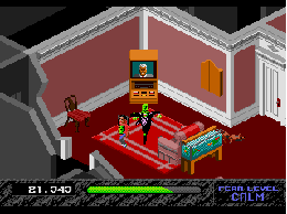 Overview Haunting is about this green ghost called Polterguy who dislikes a family known as the Sardinis for some reason and all he wants to do is scare the hell out of them all. Sounds fun eh? Well, you're in control of Polterguy, so get ready for some freakish fun! Gameplay The objective is to scare all the Sardinis out of their house by entering these things called "fright ems" then coming out of them to make something scare the Sardinis. These "fright ems" look like glowing orbs and appear all over the house you are in, such as furniture, the floor and even the toilet. These "fright ems" can do some pretty interesting things like turn a mat of carpet into a puddle of oozing blood. When a Sardini sees this, he or she will shows signs of being scared, like their pants coming off. After a Sardini's fear level reaches the panic stage, they run straight out of the house. Your life meter is a green ecto bar. After it runs out, you have to go into this dungeon to collect some more. As you can see, you've probably noticed how original this game is. What makes this game special is how there is that element of surprise and sneaking around unnoticed. One thing I think is missing in the game that would have made it better is how there isn't any darkness. If you thought about it, you're 10 times more likely to be scared in the dark than if you were in light (for me anyway). The most annoying thing I found in this game is when your ecto bar runs out from time to time and you get sent to a dungeon to collect more ecto. I got really sick of collecting ecto in the dungeon, it nearly put me off trying to finish this game. 8 out of 10 Graphics The whole game takes place in a 3D isometric view in various houses and dungeons. The graphics are very detailed, all large, bright and colourful. They closely resemble the old Last Ninja games from the Commodore computers. Some of the animations look very neat as well, particularly when the Sardinis freak out when they see the fright ems. One minor bad point is how most of the house graphics are just plain colours, like the walls. But overall, the graphics are excellent. 4.5 out of 5 Sound and Music The sound effects are very atmospheric and funny, fitting in very well with the game. However the music tracks are repetitive, being played throughout the game and you can't turn it off (unless you have the cheat). 3 out of 5 Game Design Throughout the game, you'll be trying to scare the Sardini's in one of their fine houses. The scene changes on screen when you go into another room. While all looks very neat exploring the houses that are like the size of mansions, you'll always get lost making it difficult sometimes to find those darn Sardinis, unless you've played the game alot previously. An optional map would have helped alot. Or to prevent the houses from being too big at one height level, there should have been more than one story for the houses. Also, it would have been nice for allowing Polterguy to go outside of the house. Imagine how much more fun it would have been; going out into the front yard or even chasing the Sardinis out in the streets! Or are ghosts only confined to the indoors? 3.75 out of 5 Longevity (Warning: do not read this section if you actually intend to play this game) This is one of those games where you have to finish it in one go at it. No continues or saving. You game over after you've lost all your energy trying to collect ecto in the dungeons, then you have to start all over again. To make this all worse, you don't even get rewarded with anything after you've completed the game, so your efforts are pretty much wasted (didn't mean to spoil anything!). However, this is an OK game to come back to once in a while, especially for the kids. 1 out of 5 For: fun to scare em Sardnins, original, bright and colourful graphics, atmospheric soun effects, nice looking houses. Against: no darkness, can get sick of collecting ecto, alot of plain colour shading, repetitive music, getting lost, game doesn't last for long. Conclusion A fairly good game with an original idea. Only those ecto collecting parts of the game and poor longevity prevented this game from gaining a Bronze or Silver award. |